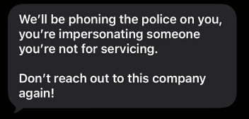 We think Redlick is trying to say that she is going to report Crystal to the police.  So Crystal inquiring about a service that is obviously a scam is somehow a crime – but of course what Redlick is doing is not.