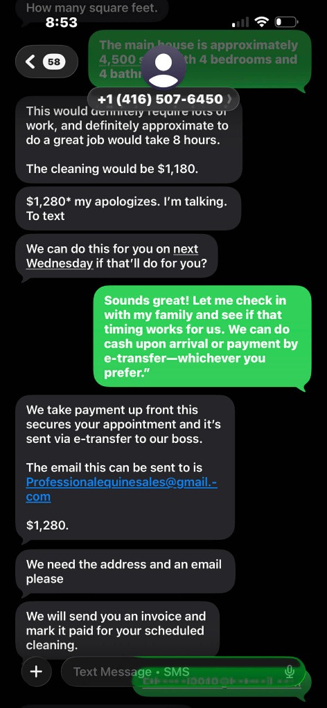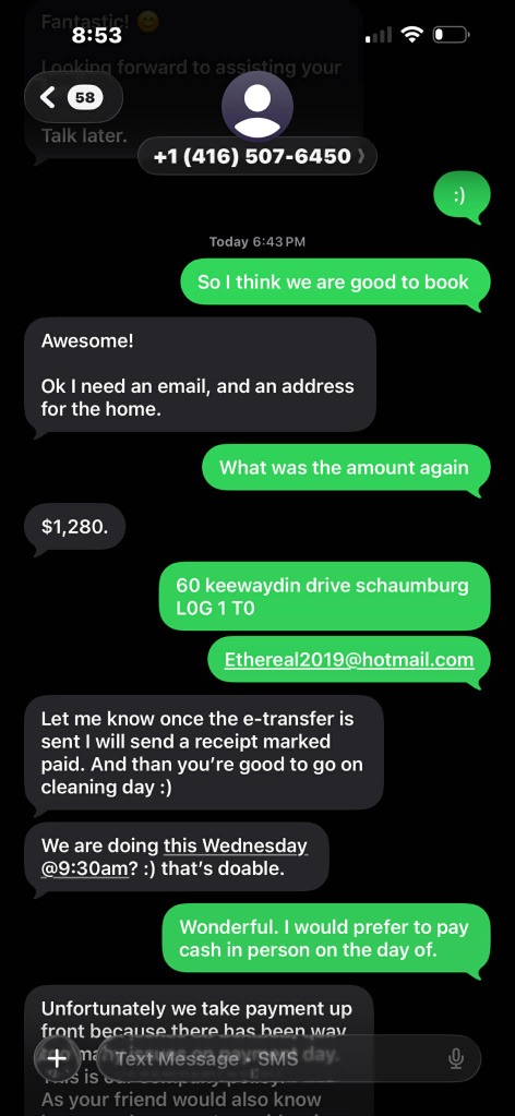 Collects payment upfront via e-transfer.